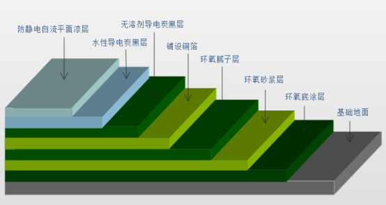 ④環(huán)靜電中涂:防靜電中涂將環(huán)氧樹脂加入適量的石英砂,用鏝刀將其均勻涂布一至二道